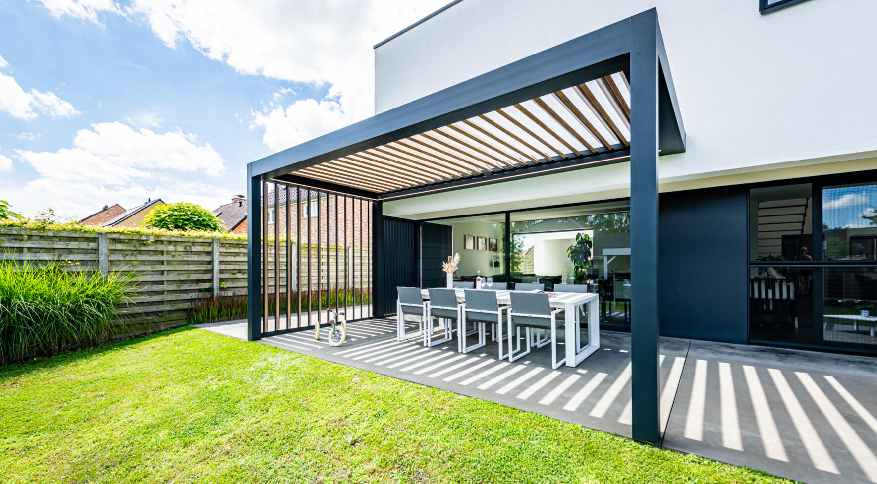 La Pergola à toile enroulable Z!P se caractérise par son toit incliné et ses gouttières discrètement intégrées dans les poteaux. Savourez pleinement votre espace extérieur à l'abri.